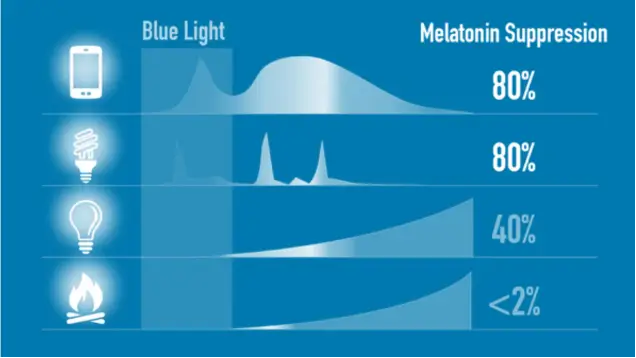 Blue light from computer screens, phones, TVs, and lamps suppresses melatonin, delaying sleep and lowering sleep quality. It disrupts your circadian rhythm. The modest amounts of blue light from lamps or wood fires has little effect on sleep or will cause fatigue the next day.