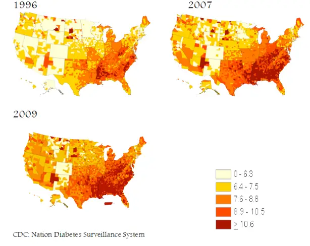 There are 86 million pre-diabetics (synonyms; insulin resistance syndrome or metabolic syndrome). Ten years of the epidemic are shown below. By 2050, with current trends, 1 in 4 of all Americans will have diabetes. (CDC; Diabetes at a Glance). The US will disappear in a sea of orange.